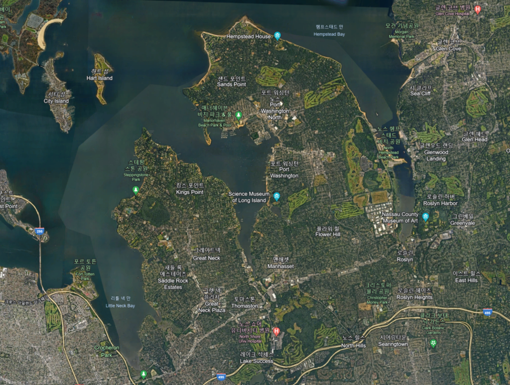 서반구에서 가장 발달된 염수체, 즉 롱아일랜드 해협이라 불리는, 물에 젖은 넓은 뒷마당 안으로 솟아 나온 그 두 지대는 완전한 달걀 모양은 아니었지만, …