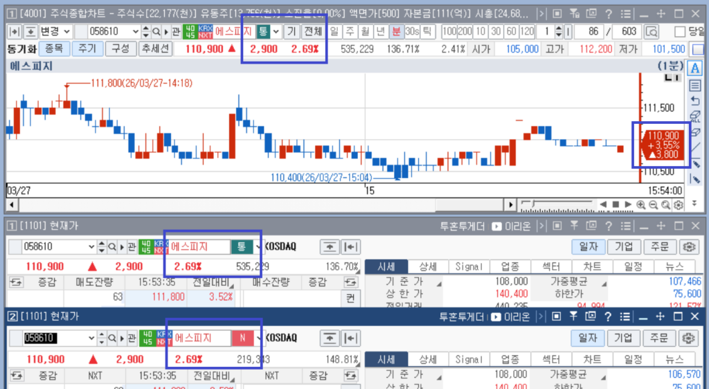 차트 창의 위에 나오는 대이터는 현재 가격 창의 그것들과 같다. 그러나 오른쪽의 것들은 아니다. 거래소 통합으로 선택해도 이들 값은 넥스트래이드의 전 영업일 종가를 기준으로 계산된다.